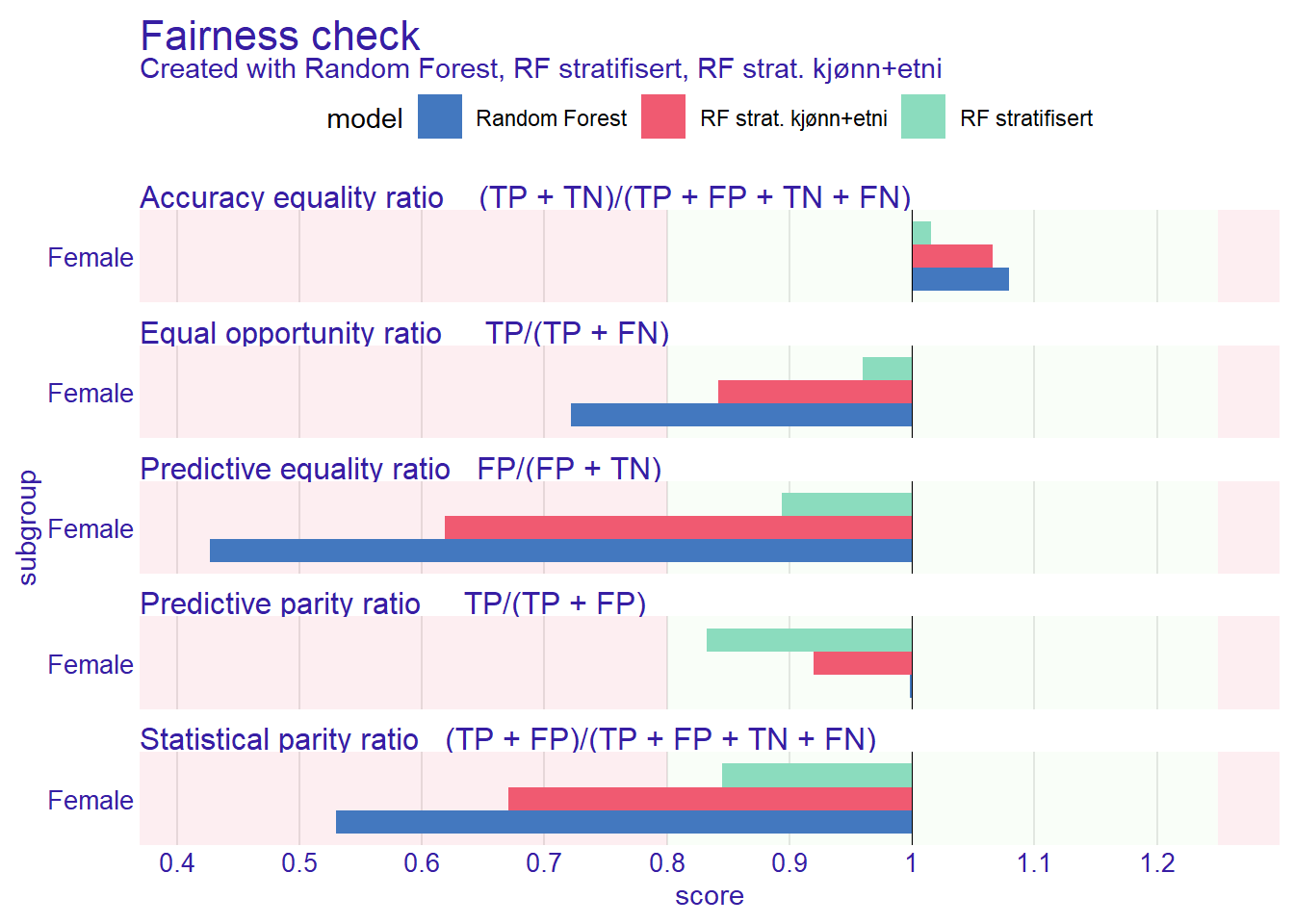 Nå kan vi sammenligne alle tre modellene i ett fairness-kall: