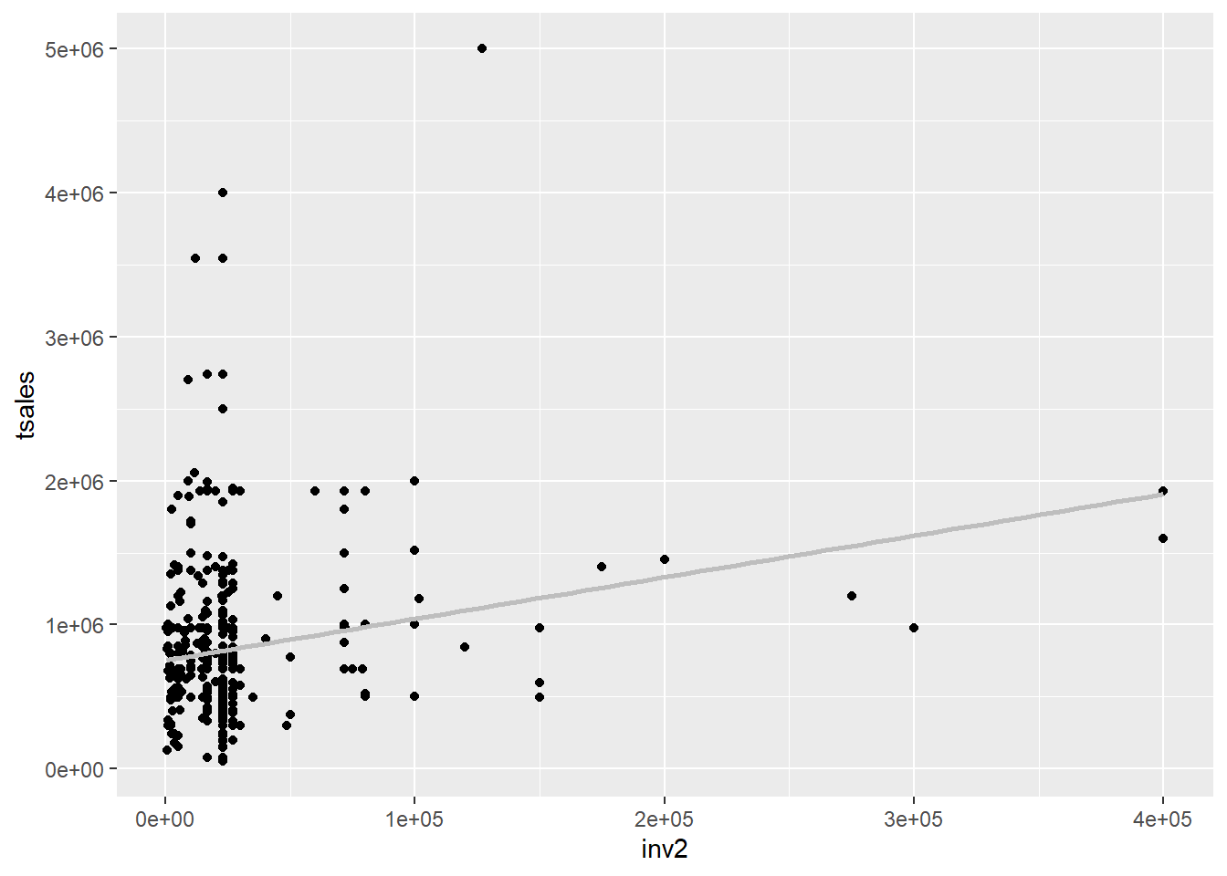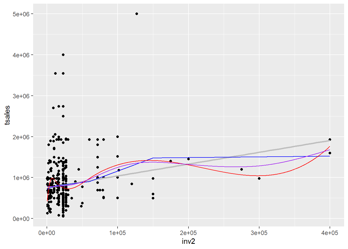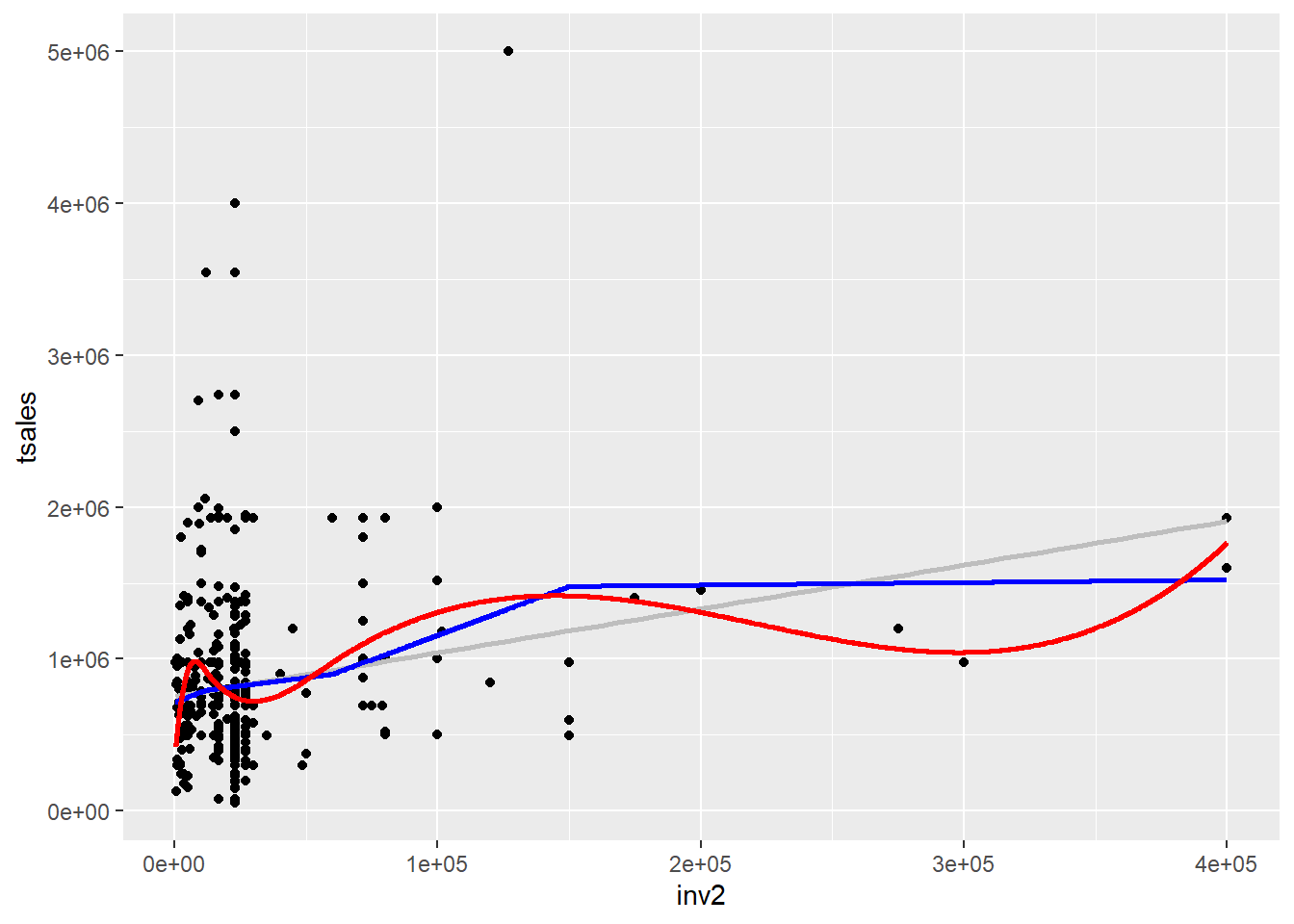 model1 <- lm(tsales ~ bs(inv2, knots = c(12000, 60000, 150000), degree = 1), data = Clothing)