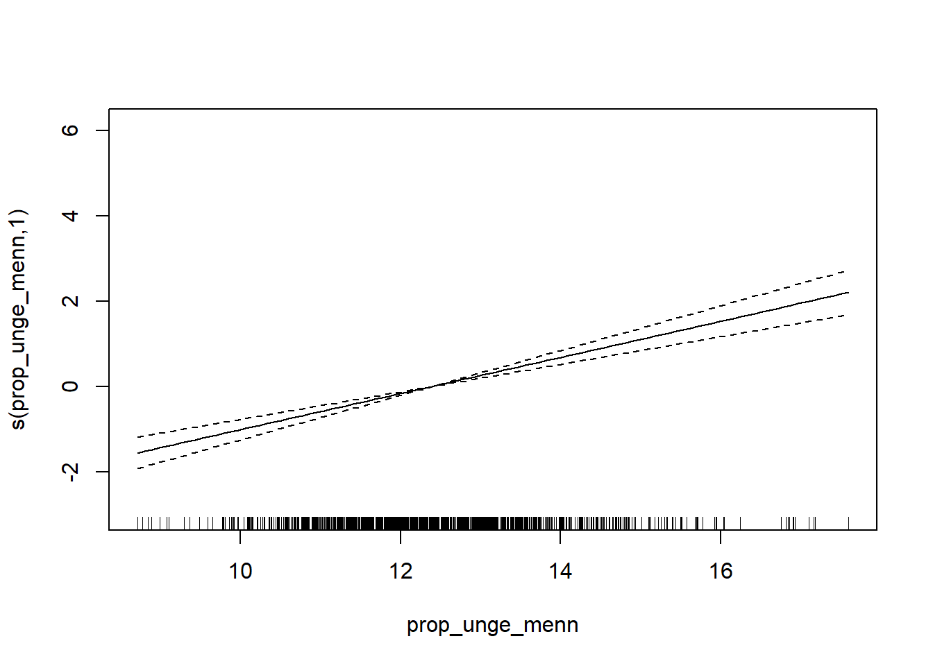 gam_mod <- gam(voldskriminalitet ~ s(prop_unge_menn) + s(inntekt_totalt_median) + s(shj_unge),