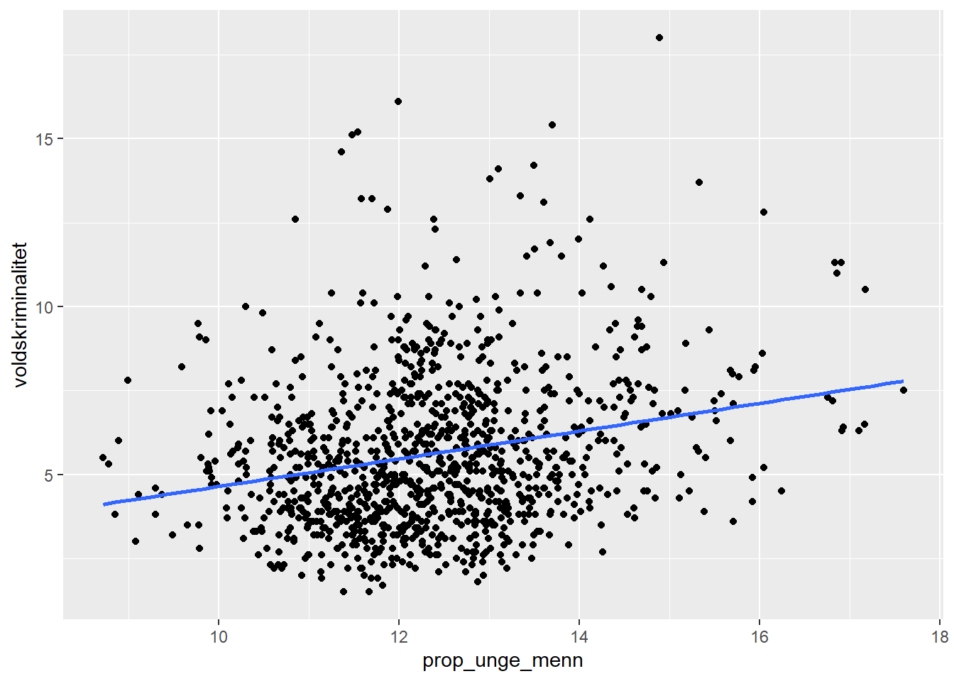 En ganske åpenbar faktor som forklarer forekomsten av vold er andel unge menn i kommunen. Rett og slett fordi dette er den demografiske gruppen som begår mest vold - og kriminalitet generelt, faktisk. Hvis befolkningssammensetningen forventes å bli yngre vil det medføre flere unge menn, og da kan vi kanskje forvente at det blir flere voldshendelser bare av den grunn? Sammenhengen mellom unge menn og voldsrate kan estimeres med helt vanlig lineær regresjon.
