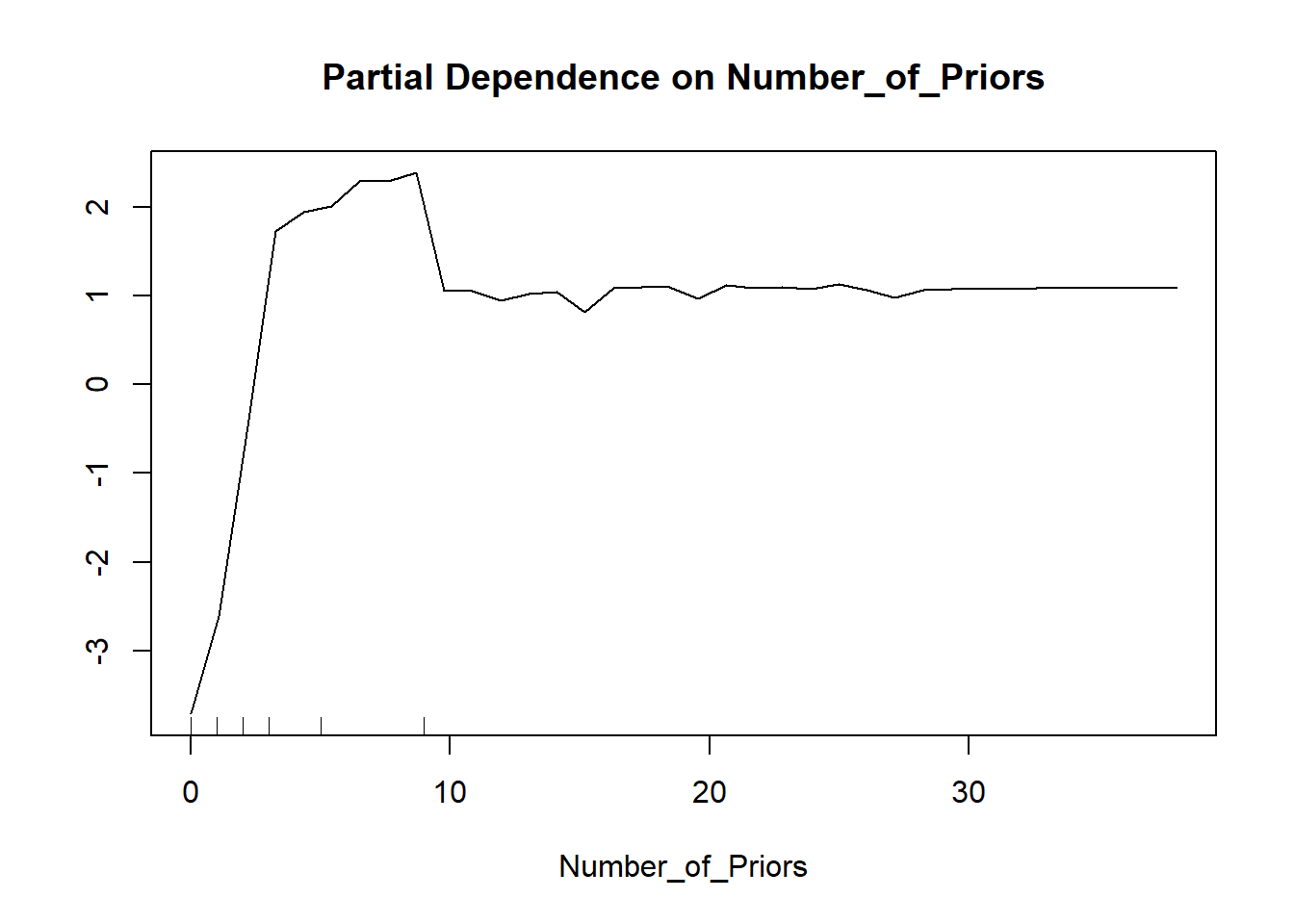 Plottet viser at sannsynligheten for tilbakefall øker med antall tidligere lovbrudd, noe som er intuitivt rimelig.